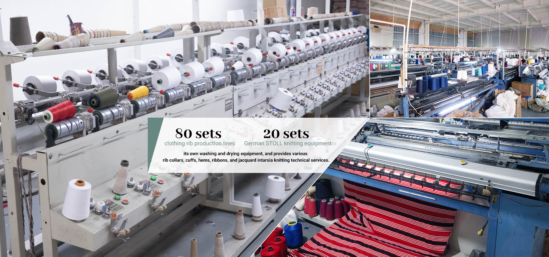 Our factory has 80 sets of clothing rib production lines, 20 sets of German STOLL knitting equipment, its own washing and drying equipment, and provides various rib collars, cuffs, hems, ribbons, and jacquard intarsia knitting technical services.